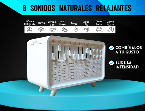 Incluye 8 sonidos relajantes: lluvia, olas del mar, bosque, viento suave, arroyo, canto de pájaros, ruido blanco y ruido rosa. Todos están diseñados para mejorar el sueño y reducir el estrés.